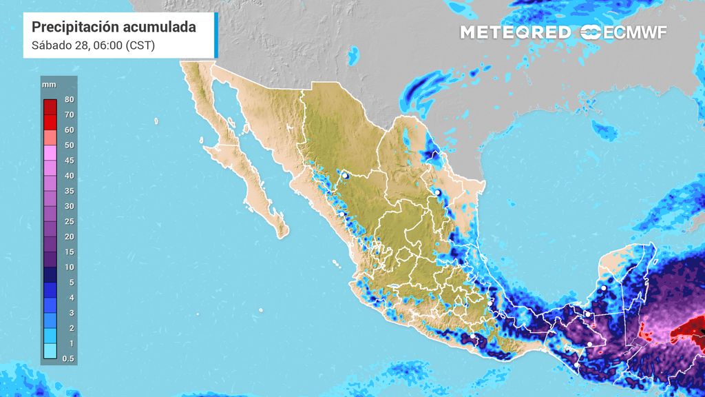 El Sureste mexicano se perfila como la zona más vulnerable ante las precipitaciones. Se pronostican lluvias fuertes con acumulados de entre 25 a 50 mm, específicamente en los estados de Chiapas y Tabasco. Estos eventos podrían estar acompañados de descargas eléctricas y caída de granizo.
