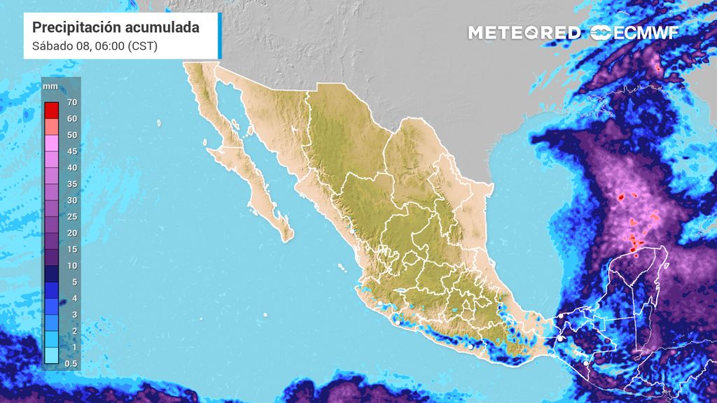 En este sentido, los pronósticos indican que se presentarán lluvias fuertes (25 a 50 mm) en Tabasco, Chiapas, Campeche, Yucatán y Quintana Roo, lluvias moderadas (5 a 25 mm) en Oaxaca y Veracruz.
