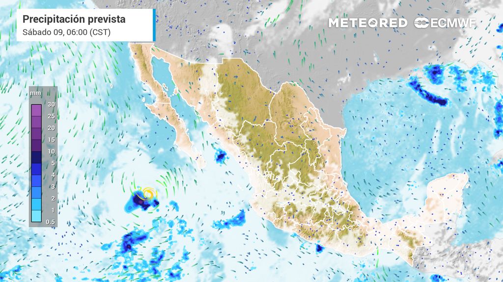 Al respecto, se pronostican lluvias intensas (75 a 100 mm) en Nayarit, Jalisco, Colima, Michoacán y Guerrero, lluvias muy fuertes (50 a 75 mm) en Sinaloa, Durango, Estado de México, Campeche, Yucatán y Quintana Roo, lluvias fuertes (25 a 50 mm) en Sonora, Chihuahua, Zacatecas, Aguascalientes, Guanajuato, Ciudad de México, Morelos, Puebla, Oaxaca, Chiapas, Veracruz y Tabasco.