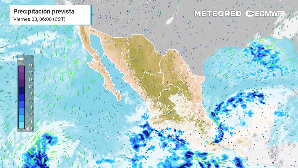 En este sentido, se pronostican lluvias intensas (75 a 100 mm) en Veracruz (sur), Tabasco (oeste y sur), Chiapas (norte y costa), Oaxaca (oeste) y Guerrero (este), lluvias muy fuertes (50 a 75 mm) en Campeche, Yucatán y Quintana Roo, lluvias fuertes (25 a 50 mm) en Durango, Sinaloa, Nayarit, Jalisco, Colima, Michoacán, Morelos, Puebla y Tamaulipas.