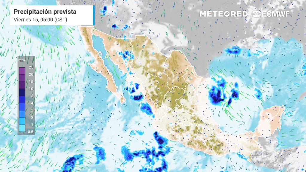 También se prevén lluvias moderadas (5 a 25 mm) en Baja California Sur, Coahuila, Nuevo León, Tamaulipas, San Luis Potosí, Zacatecas, Aguascalientes, Guanajuato, Querétaro e Hidalgo.
