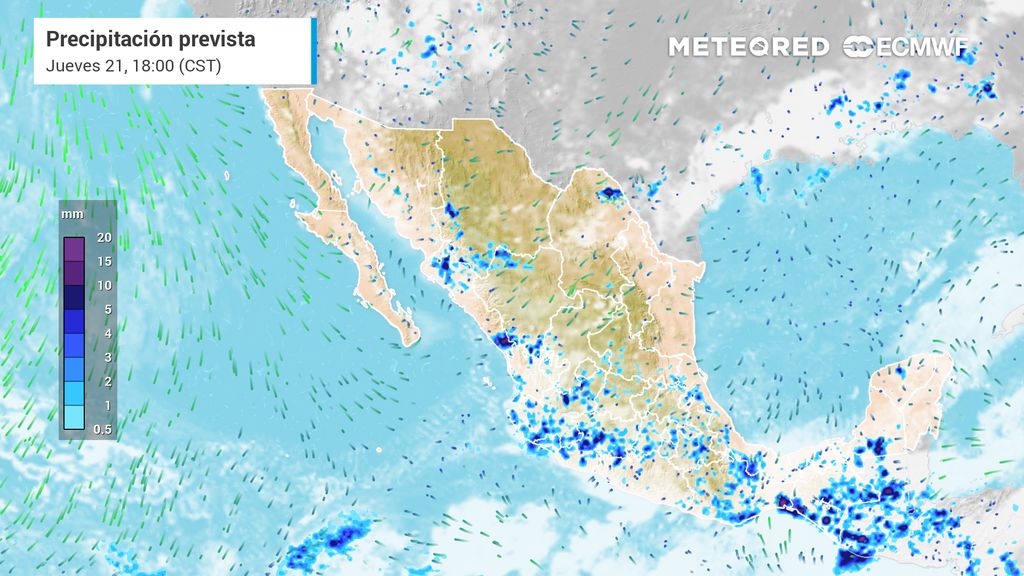 Al respecto, se pronostican lluvias intensas (75 a 100 mm) en Jalisco y Chiapas, lluvias muy fuertes (50 a 75 mm) en Nayarit, Colima, Michoacán, Guerrero, Oaxaca, Puebla, Veracruz, Campeche, Yucatán y Quintana Roo, lluvias fuertes (25 a 50 mm) en Sonora, Sinaloa, Chihuahua, Durango, Coahuila, Nuevo León, Tamaulipas, San Luis Potosí, Estado de México, Morelos y Tabasco.