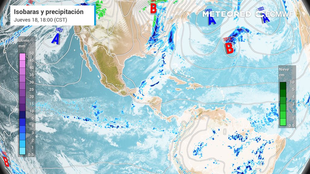 Por lo anterior, los pronósticos indican que se presentarán lluvias fuertes (25 a 50 mm) en Tamaulipas, lluvias moderadas (5 a 25 mm) en Coahuila, Nuevo León, San Luis Potosí, Michoacán, Guanajuato, Querétaro, Hidalgo, Estado de México, Ciudad de México, Morelos, Guerrero, Oaxaca, Puebla, Veracruz, Chiapas y Quintana Roo.