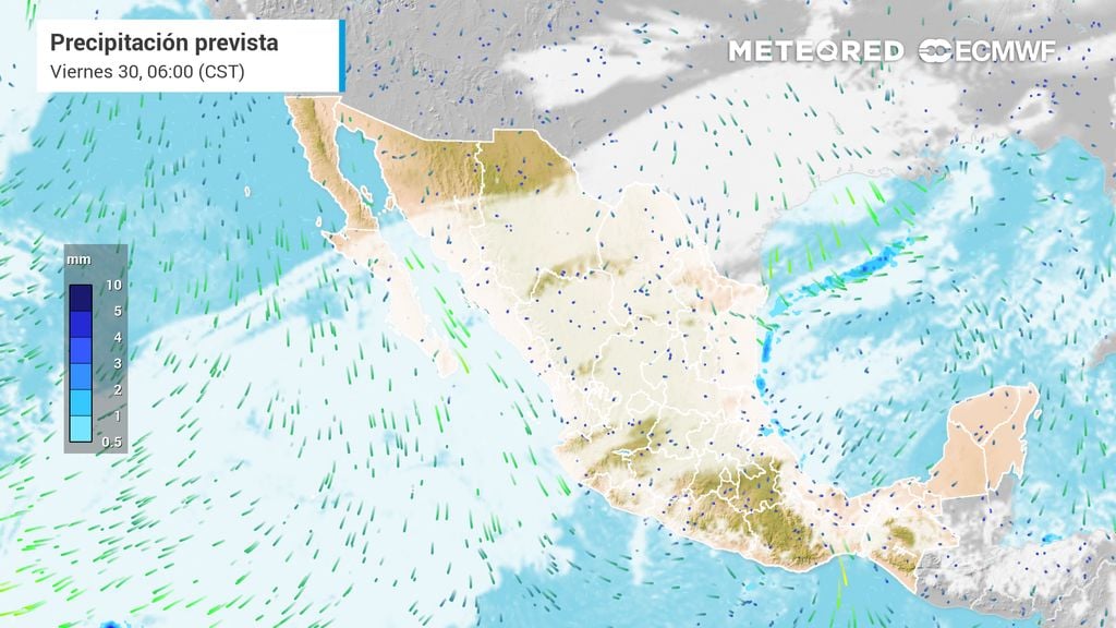Un factor de riesgo importante para la navegación y el turismo será el viento. Prevalecerá el evento de "Norte" con rachas intensas de 70 a 90 km/h en el istmo y golfo de Tehuantepec, generando un oleaje elevado de 3 a 4 metros de altura. En el Caribe mexicano, específicamente en Quintana Roo, las rachas de viento alcanzarán los 60 km/h con oleaje de 2 a 3 metros, por lo que se recomienda precaución en zonas costeras.