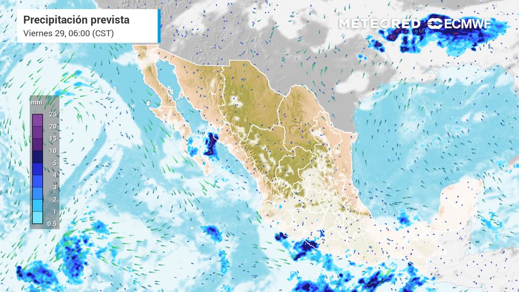 Al respecto, se pronostican lluvias intensas (75 a 100 mm) en Sonora, Chihuahua, Sinaloa, Puebla, Veracruz y Oaxaca, lluvias muy fuertes (50 a 75 mm) en Durango, Jalisco, Colima, Michoacán, Guerrero, Estado de México, Morelos, Chiapas, Campeche y Yucatán.