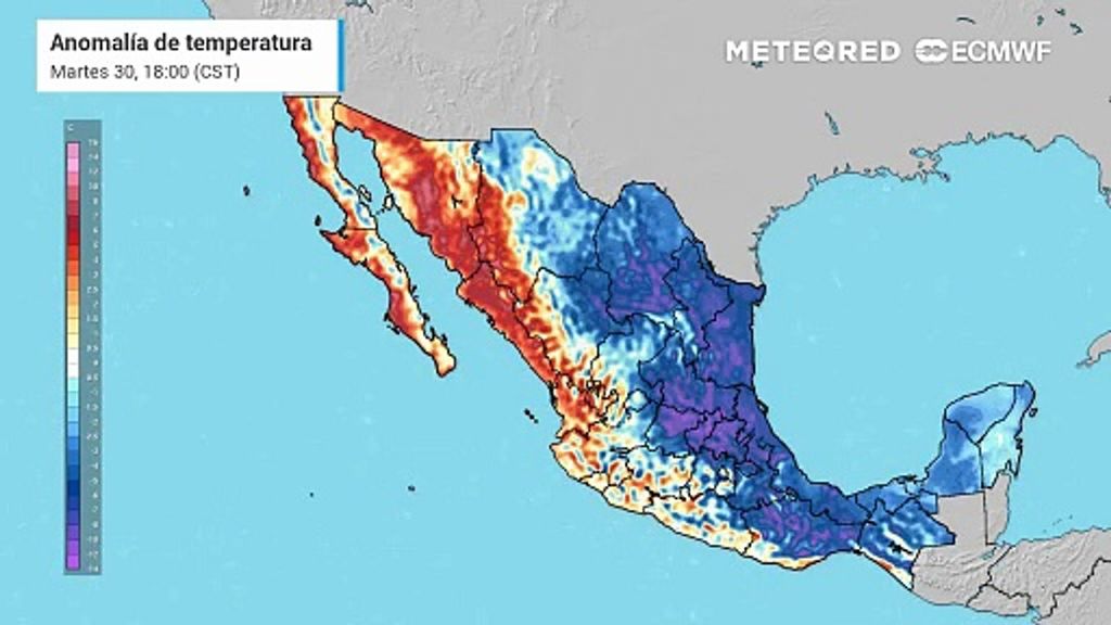 Posteriormente, hacia la madrugada del jueves se prevén temperaturas mínimas de -10 a -5 °C en Chihuahua y Durango, -5 a 0 °C en Baja California, Sonora, Nuevo León, San Luis Potosí, Zacatecas, Guanajuato, Michoacán, Estado de México, Hidalgo, Tlaxcala, Puebla, Veracruz y Oaxaca, y 0 a 5 °C en Coahuila, Tamaulipas, Aguascalientes, Jalisco, Querétaro, Ciudad de México y Morelos.