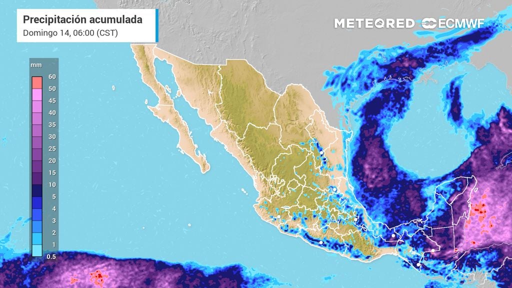 Por lo anterior, los pronósticos indican que se presentarán lluvias fuertes (25 a 50 mm) en Chiapas, Yucatán y Quintana Roo, lluvias moderadas (5 a 25 mm) en Veracruz, Puebla, Estado de México, Guerrero, Oaxaca, Tabasco y Campeche.