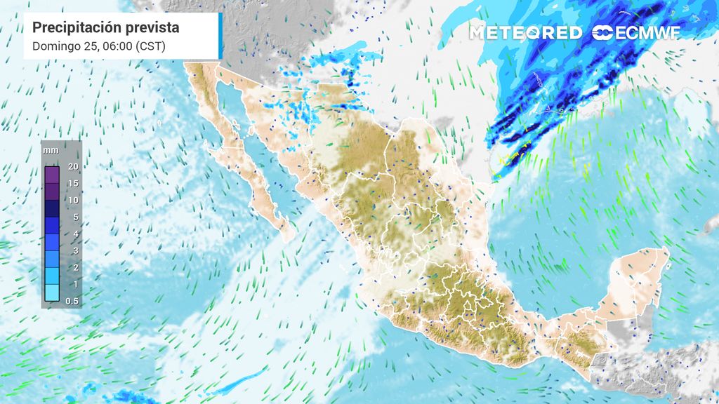 Mientras el norte se congela, una vaguada en niveles altos y el ingreso de humedad del Pacífico y el Golfo de México mantendrán lluvias moderadas (5 a 25 mm) en el sureste, la Península de Yucatán y el sur del país.