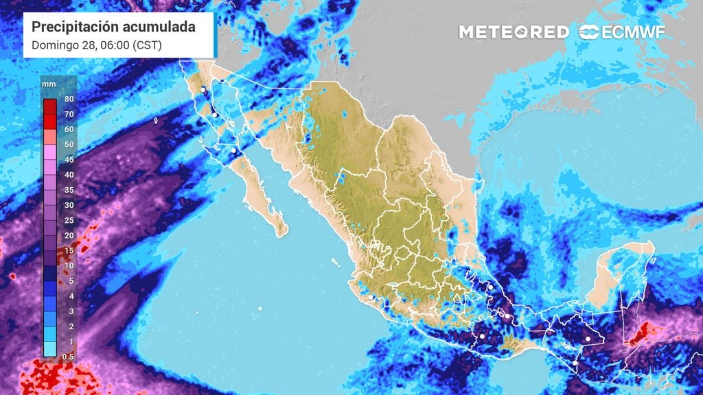 En este sentido, los pronósticos indican que se presentarán lluvias muy fuertes (50 a 75 mm) en Chiapas, lluvias fuertes (25 a 50 mm) en Baja California, Guerrero, Oaxaca, Veracruz y Tabasco, lluvias moderadas (5 a 25 mm) en Baja California Sur, Sonora, Puebla y Veracruz.