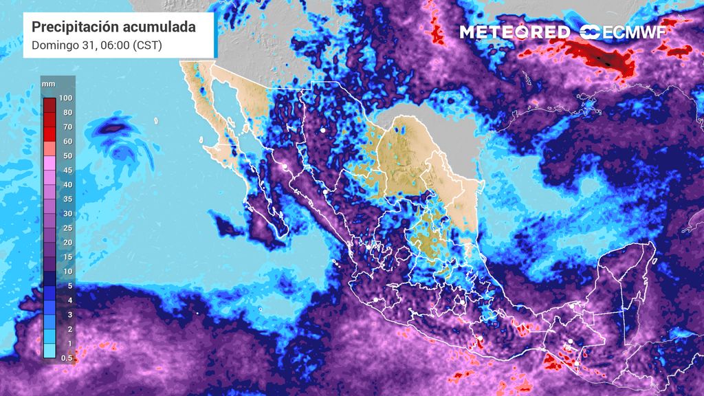 Al respecto, se pronostican lluvias intensas (75 a 100 mm) en Veracruz, Guerrero, Oaxaca, Chiapas y Tabasco, lluvias muy fuertes (50 a 75 mm) en Sonora, Chihuahua, Jalisco, Michoacán y Campeche, lluvias fuertes (25 a 50 mm) en Sinaloa, Durango, Nayarit, Colima, Estado de México, Ciudad de México, Morelos, Puebla, Yucatán y Quintana Roo.
