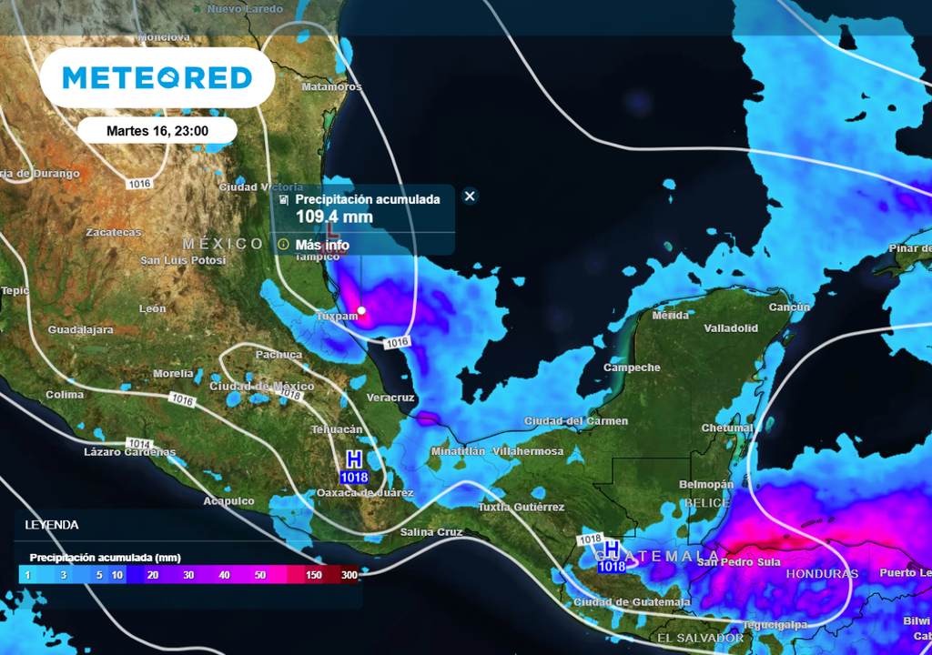 El frente 21 que se extiende con características de estacionario sobre el Golfo de México hasta el Este del país, mantiene la propagación de nubosidad convectiva, lo que a su vez en combinación con la masa de aire polar, favorecen la probabilidad de aguaceros fuertes de hasta 100 mm en el Norte del estado de Veracruz y el sur del estado de Tamaulipas.