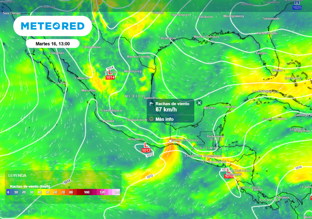 El viento de componente norte da pasa a un efecto "Tehuantepecano" con rachas de 60 a 70 km/h en el Istmo y Golfo de Tehuantepec, afectando directamente en los estados de Oaxaca y Chiapas.
