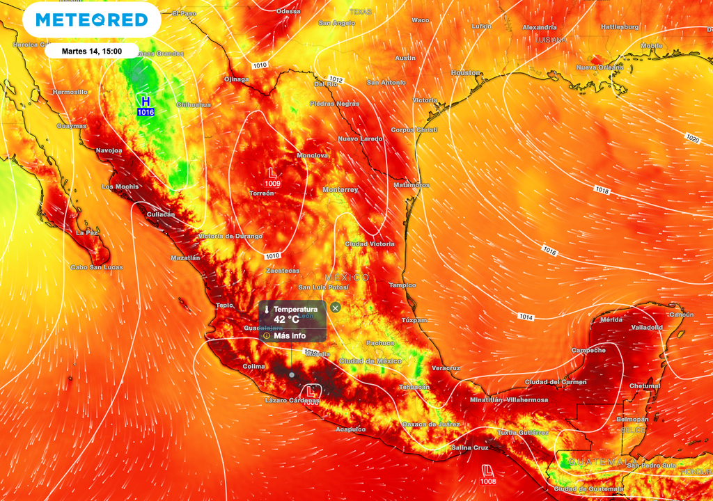 En Veracruz, Tabasco, Campeche y Quintana Roo, se esperan máximas de 35 °C a 40 °C, con vientos de componente este y sureste de 15 a 30 km/h. Las precipitaciones en esta región serán puntuales y vendrán acompañadas de alguna tormenta eléctrica, marcando una transición hacia condiciones ligeramente más húmedas a pesar de la persistencia de las altas temperaturas diurnas.