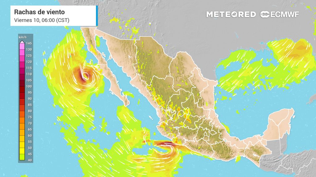 Además de lluvias, la enorme circulación del huracán “Priscilla” favorecerá vientos de 60 a 80 km/h en Baja California Sur. Además, marcados gradientes de presión a nivel regional darán paso a rachas de 50 a 60 km/h en Coahuila, Nuevo León, San Luis Potosí, Zacatecas, Aguascalientes, Guanajuato, Querétaro y costas de Veracruz, Oaxaca y Chiapas.