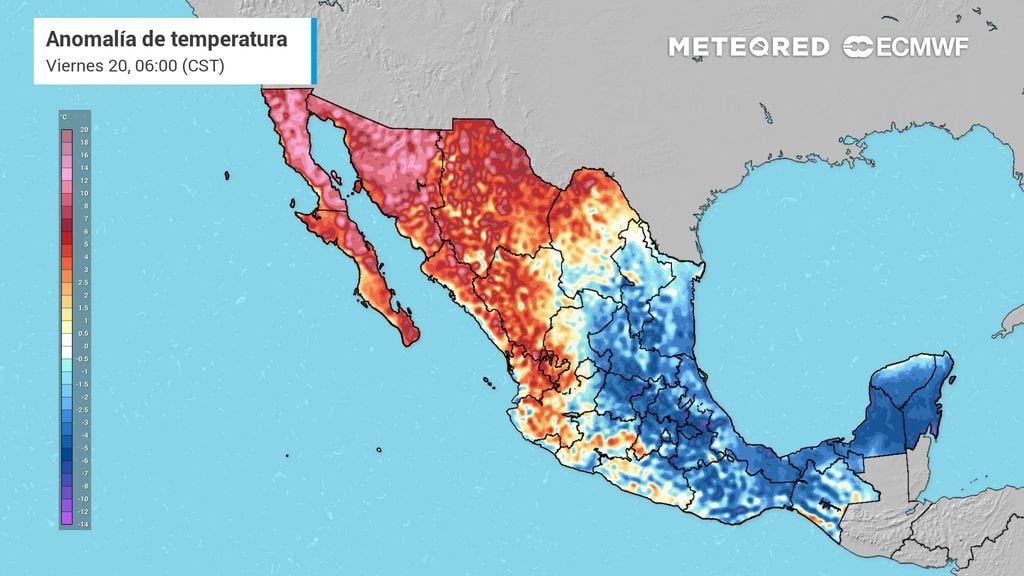 Estados como Sonora, Sinaloa, Chihuahua, las Baja Californias y norte de Coahuila experimentarán de 10 a 20 °C por encima de lo habitual próximos 5-10 días, contrastando con el Altiplano centro, Sierra Madre Oriental y parte del sureste, incluyendo el Valle de México donde las anomalías serían de 5 a 15 °C inferiores a lo normal gracias a vaguadas polares con frentes y masas frías.