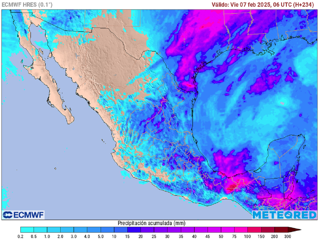 Como es común a lo largo del año, estados del Golfo de México y el sureste son los más lluviosos y este febrero no se quedarían atrás, estimándose de 50-80 mm en promedio sobre Veracruz, Oaxaca, Tabasco, Chiapas, Campeche, Yucatán, Quintana Roo. Posibles puntuales extremas de 150 a 300 mm en Tabasco, sur de Veracruz, norte de Oaxaca-Chiapas sur de Campeche y oriente de Quintana Roo.