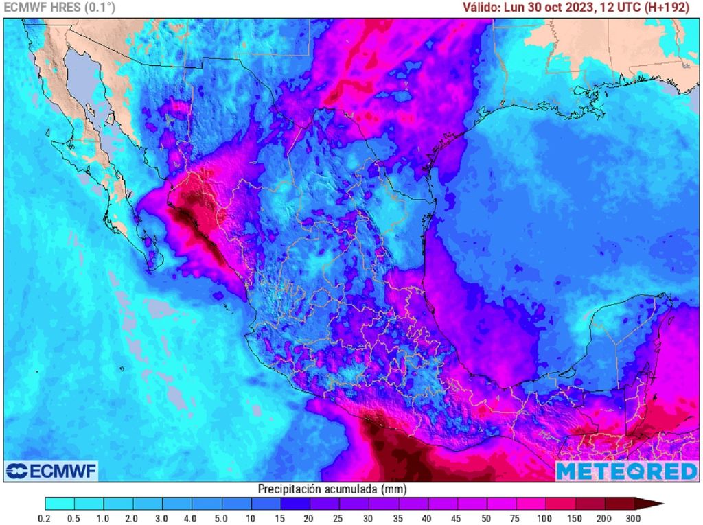 De miércoles a viernes, habrá interacción entre la tormenta tropical Otis que podría ingresar a tierra en Guerrero y una vaguada inducida en el Golfo de México, generando eventos fuertes a torrenciales y avanzando de este a oeste. El fin de semana, otro ciclón se podría formar sobre el Golfo de Tehuantepec.