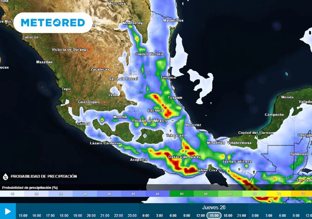 A mitad de semana se concentrarían entre Coahuila (posibles tormentas severas), Nuevo León, San Luis Potosí, Veracruz, Guanajuato, Michoacán, Querétaro, Hidalgo, Estado de México, Guerrero, Morelos, Ciudad de México, Puebla, Tlaxcala, Oaxaca, Tabasco, Chiapas, Campeche y Quintana Roo de 10-25 mm con puntuales de 50-100 mm.