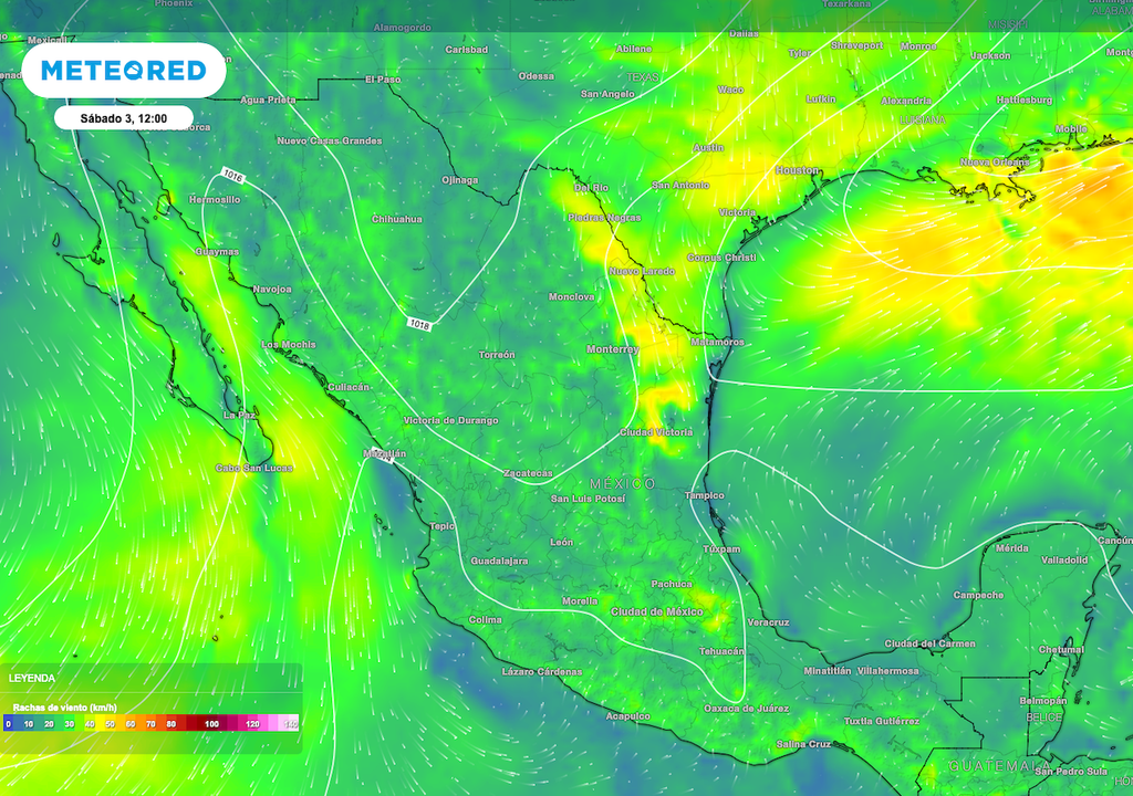El viento fuerte con rachas de 50 km/h estado de Tamaulipas, Nuevo Leon y en partes de Coahuila y San luis Potosí; mientras que con la llegada del nuevo frente hacia la noche se aceleraran los vientos para los estados de la Península de Baja California y Sonora.