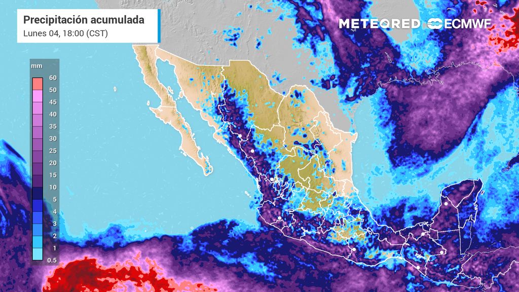Por otro lado, aún se conserva el efecto del Monzón mexicano sobre algunas entidades del Noroeste y Oeste, condición que favorece lluvias de hasta 80 mm en los estados de Sinaloa en su porción norte y centro, lluvias de hasta 60 mm en Sonora, Chihuahua, Durango y Nayarit; así como lluvias ligeras de hasta 8 mm en el centro y este de Baja California Sur.