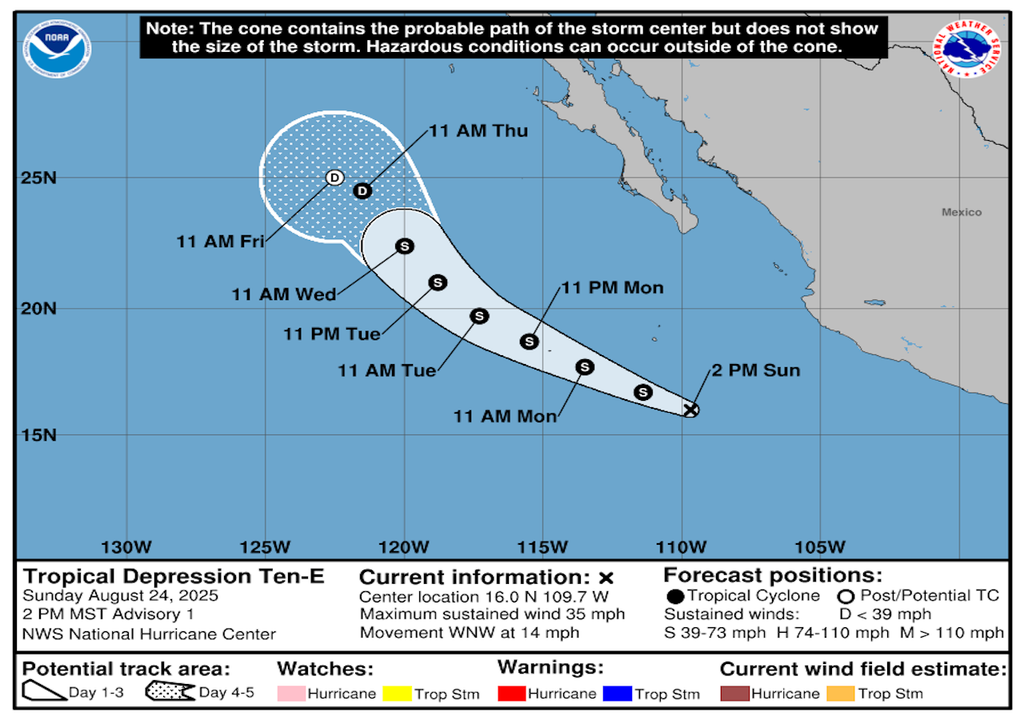 Este domingo 24 de agosto se forma la nueva depresión tropical 10-E, frente a costas del oeste mexicano, la nubosidad convectiva asociada al sistema que interactúa con la humedad del área, originando la presencia de aguaceros en las islas del Archipiélago de Revillagigedo.