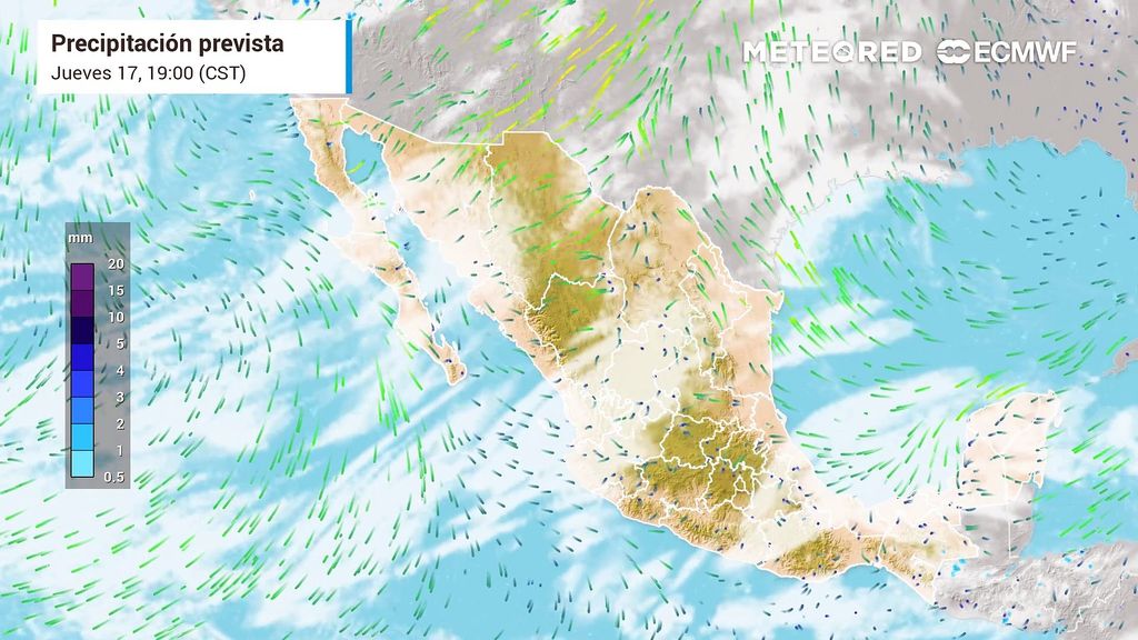 De igual manera, el ingreso de aire húmedo del mar Caribe, golfo de México y océano Pacífico, en combinación con el calentamiento diurno de la superficie, provocará lluvias dispersas en el oriente y sureste de la República Mexicana, así como en la península de Yucatán.