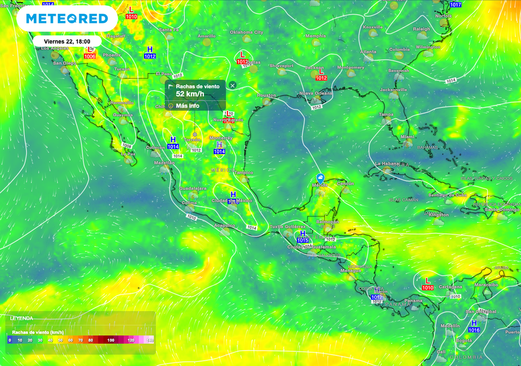 Lo que respecta a las rachas, serán del orden de 35 a 45 km/h siendo la Península de Yucatán, Guerrero, Colima y Michoacán, las entidades que registren ráfagas más fuertes.
