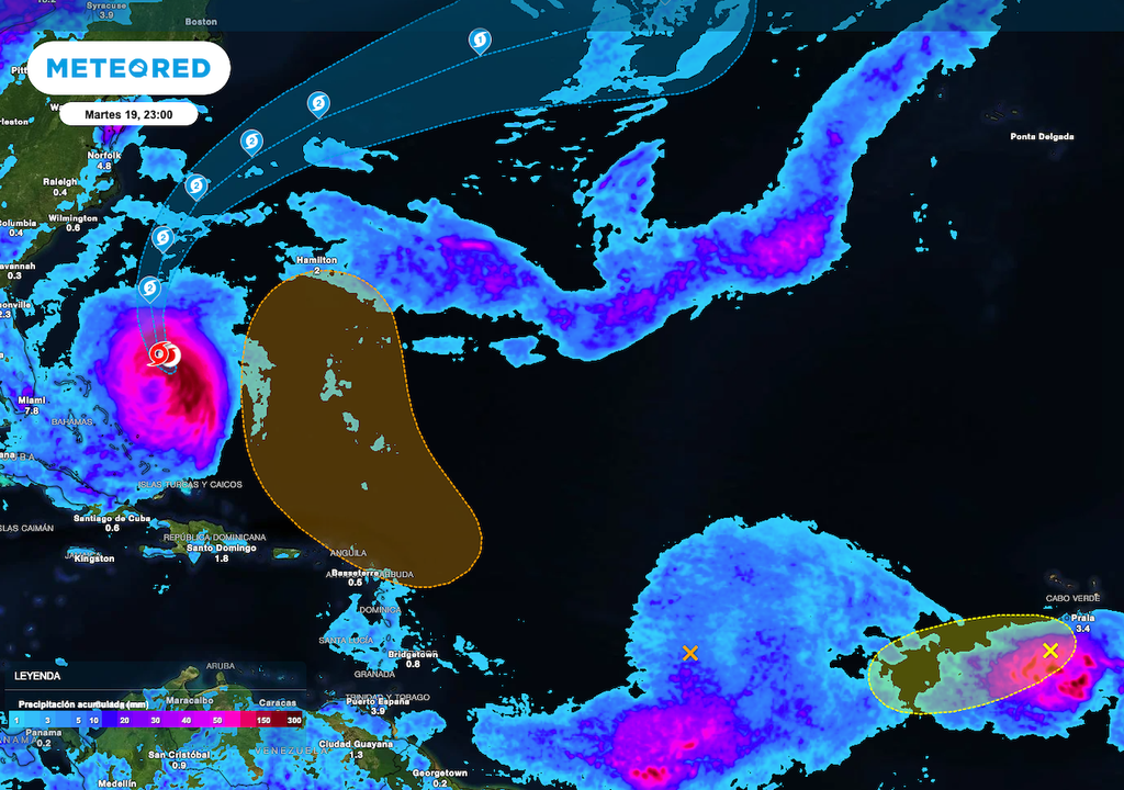 La lluvia disminuirá en las Islas Turcas y Caicos y las Bahamas al final de esta tarde y noche. Son posibles fuertes lluvias en los Outer Banks de Carolina del Norte, del miércoles por la noche hasta el jueves, con el potencial de 1 a 2 pulgadas (25 a 50 mm).
